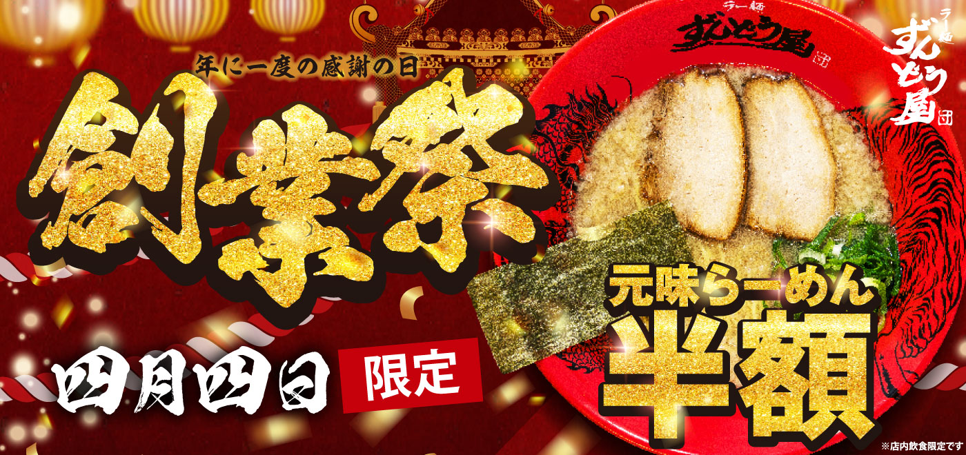 今年も開催決定!元味らーめんが半額に!4/4はずんどう屋の『創業祭』