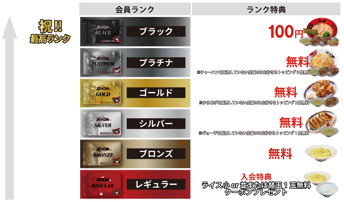 ずんどう屋のご利用金額に応じてポイントが貯まり、ポイント獲得数で会員ランクがUPします。